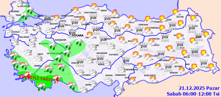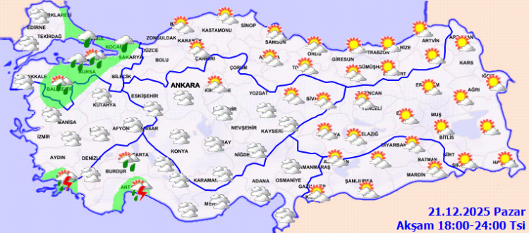 Buna göre, Marmara’nın doğusu, Batı Akdeniz, Tekirdağ, İzmir, Aydın, Muğla, Afyonkarahisar, Kütahya, Zonguldak, Bolu, Düzce, Erzincan, Tunceli çevreleri, Kırklareli’nin kıyı kesimleri, Ankara ve Eskişehir’in güneyi, Konya’nın kuzey ve batısı ile Erzurum’un batısının yağmur ve sağanak yağışlı, Güney Ege kıyıları ile Batı Akdeniz kıyılarının gök gürültülü sağanak yağışlı geçeceği tahmin ediliyor. Yağışların; Muğla ve Antalya çevrelerinde yerel kuvvetli olması bekleniyor. Sabah ve gece saatlerinde iç ve doğu bölgelerde pus ve yer yer sis bekleniyor.