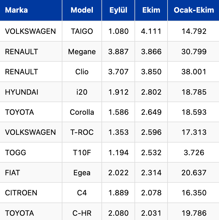 Ekim ayında model bazında satışlarda Taigo 4 bin 111 ile Türkiye’de en çok satılan otomobil oldu. İkinci sırada 3 bin 866 ile Renault Megane Sedan bulunurken, 3 bin 850 ile Renault Clio listede üçüncü sırada yer aldı.